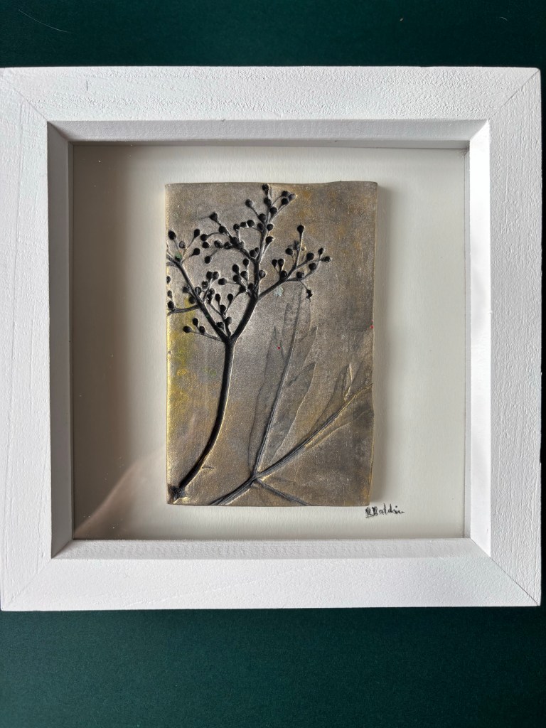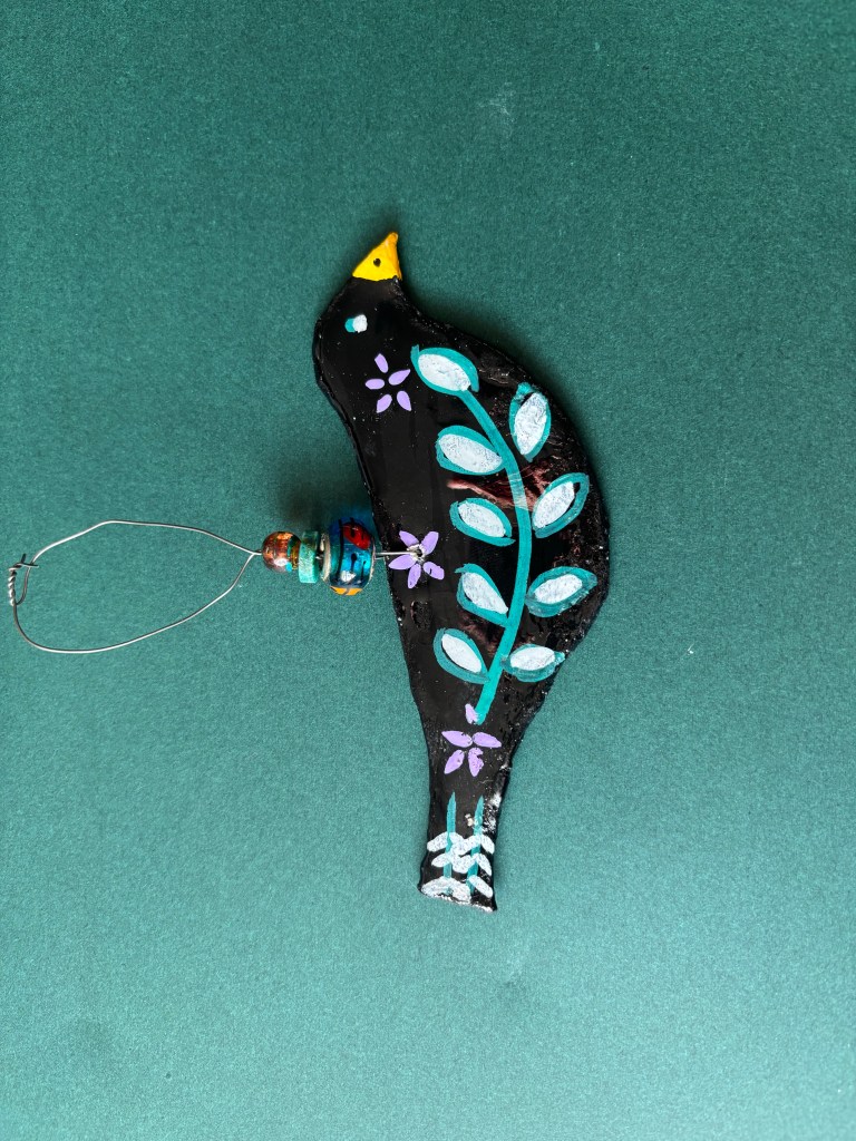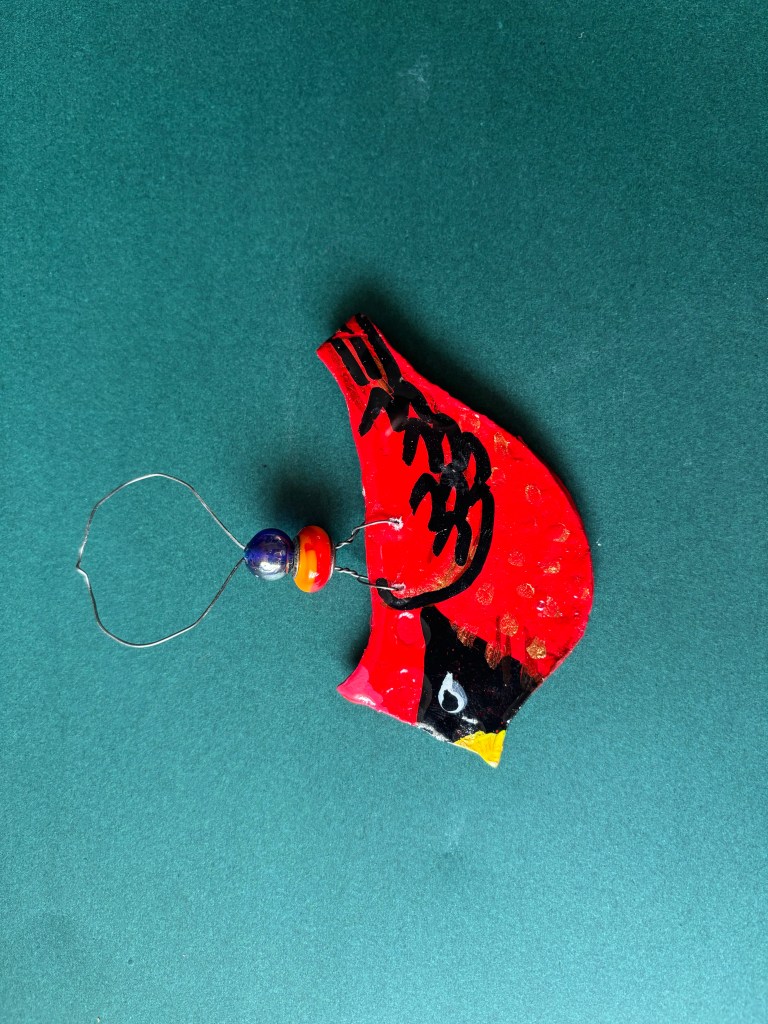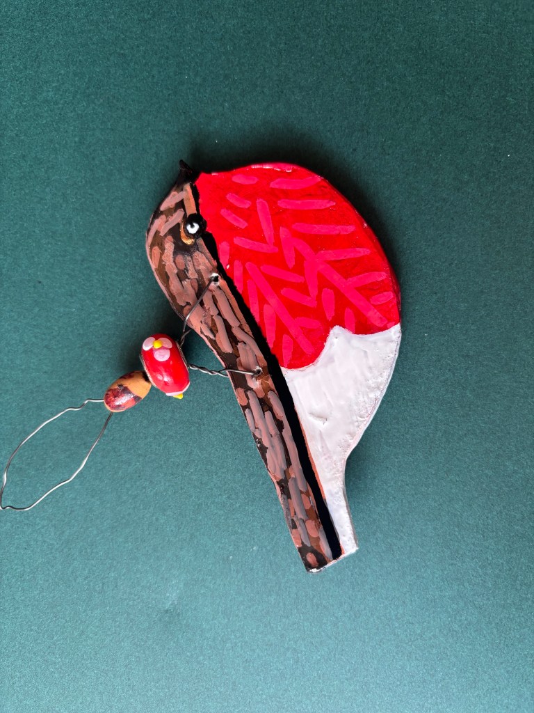 Hand made clay Christmas hanging birds are £4.75 each , brooches start from £2 each to £3.50 and botanical clay impressions from £3.50 to £5.50 .